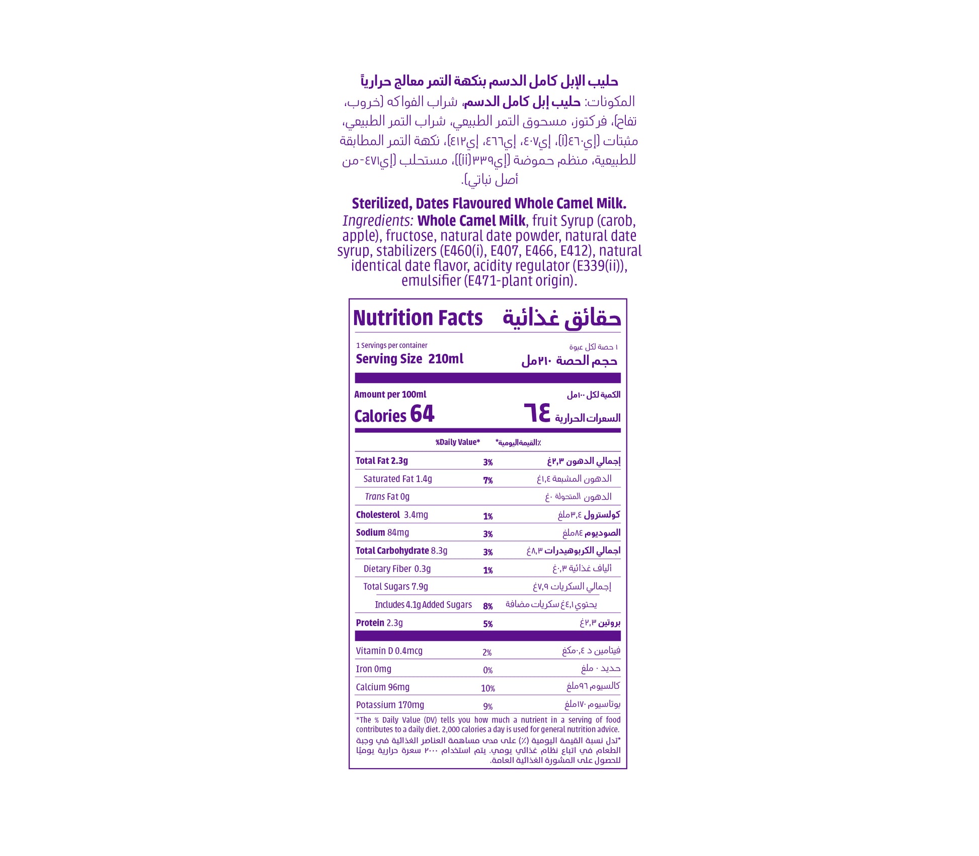 Camelicious? It’s Nutritious! It’s not just milk. It’s health, nutrition, immunity, and care in every glass. Naturally energising and easily digestible, this high-protein camel milk (25g per liter) is rich in calcium, vitamins B & C, and free from beta globulins that may cause gut inflammation. Infused with the natural sweetness of dates, it’s a delicious alternative that supports immunity with lactoferrin - making it ideal for daily wellness and active lifestyles.