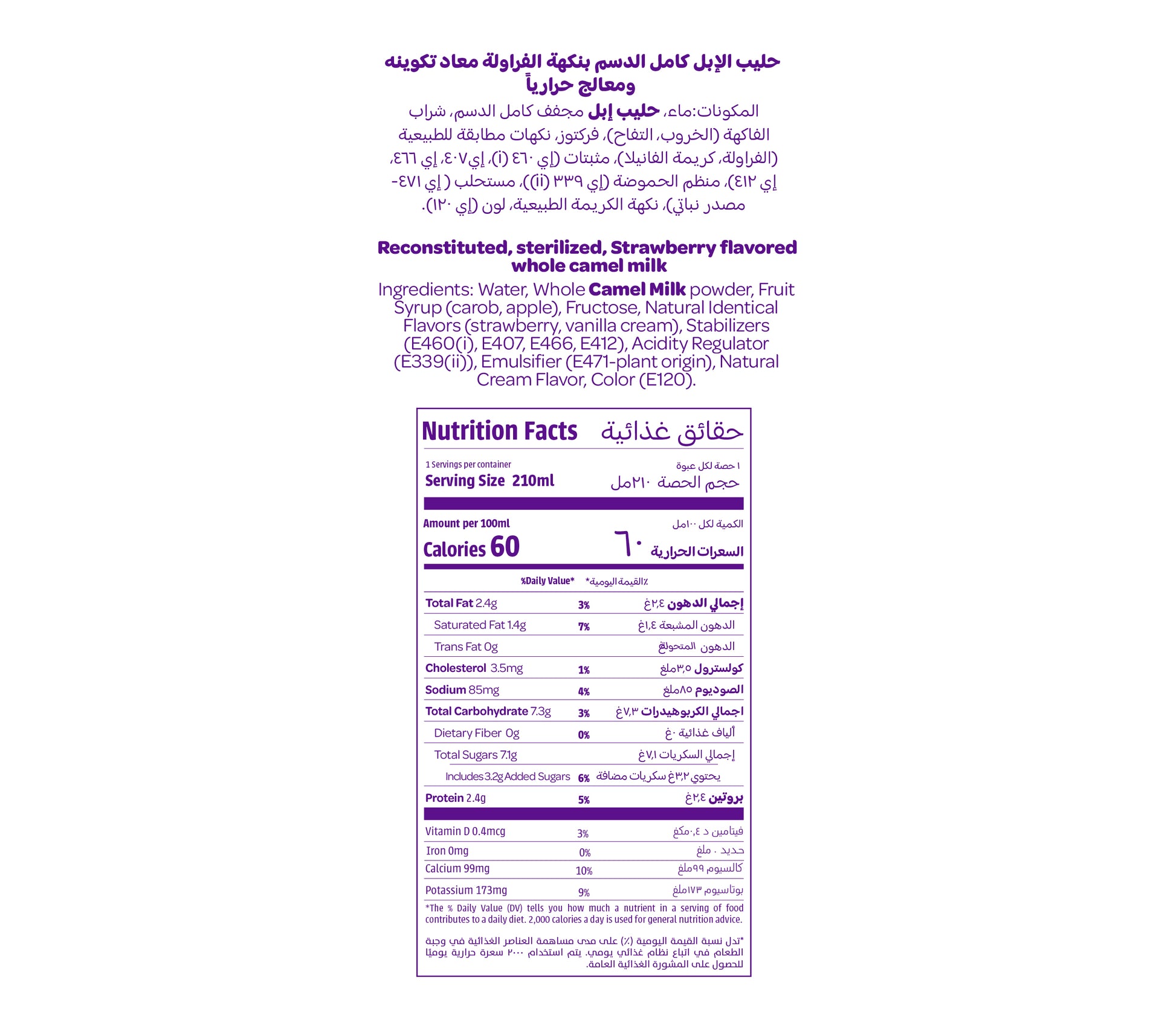 Camelicious? It’s Nutritious! It’s not just milk. It’s health, nutrition, immunity, and care in every glass. Enjoy a nutritious fruity drink with Camelicious Strawberry Flavoured Camel Milk. Blending the fruity sweetness of strawberries with the creamy goodness of camel milk, this drink is rich in protein (25g per liter), calcium, and essential vitamins B & C. Free from beta globulins, it’s gentle on the gut. With immune-boosting lactoferrin and a smooth, easily digestible formula, it’s a nutritious and delicious choice for kids and adults alike.